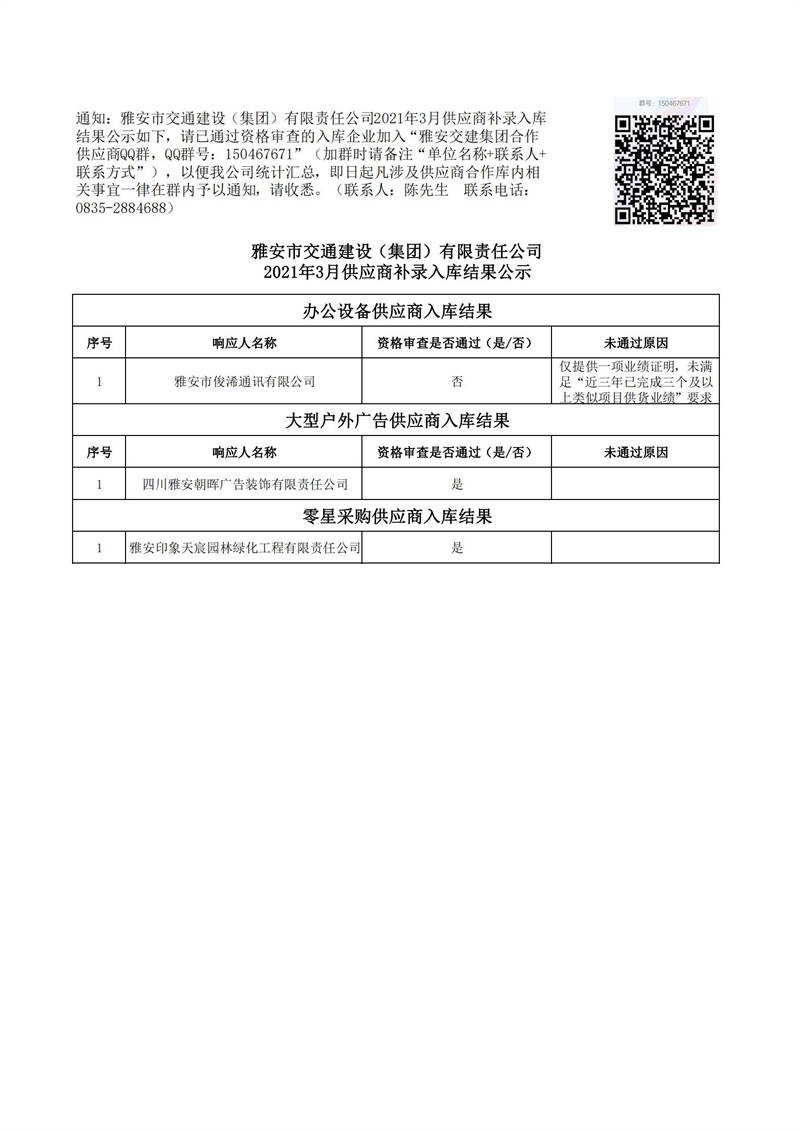 雅安市交通建設(shè)(集團(tuán))有限責(zé)任公司2021年3月供應(yīng)商補(bǔ)錄入庫結(jié)果公示