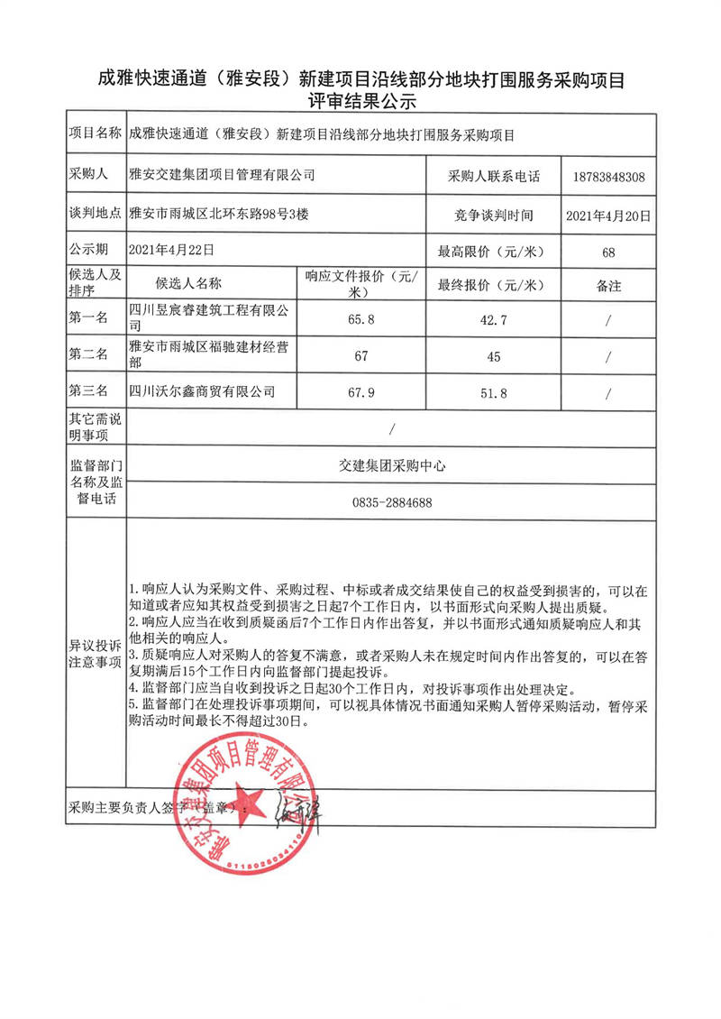 雅安交建集團項目管理有限公司成雅快速通道(雅安段)新建項目沿線部分地塊打圍服務(wù)采購項目評審結(jié)果公示