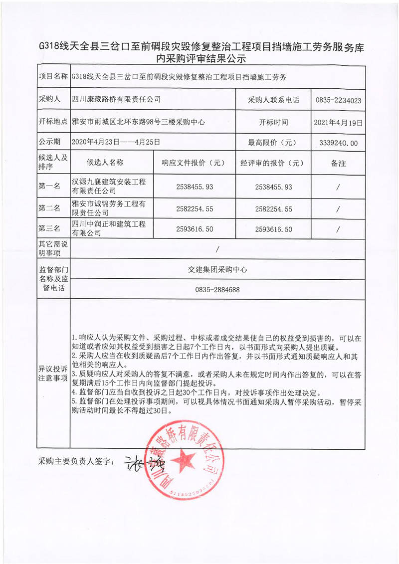 四川康藏路橋有限責(zé)任公司G318線天全縣三岔口至前碉段災(zāi)毀修復(fù)整治工程項目擋墻施工勞務(wù)服務(wù)庫內(nèi)采購評審結(jié)果公示