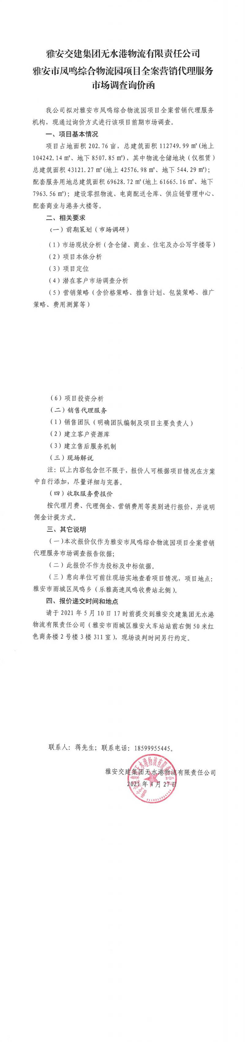 雅安交建集團(tuán)無水港物流有限責(zé)任公司雅安市鳳鳴綜合物流園項(xiàng)目全案營銷代理服務(wù)市場(chǎng)調(diào)查詢價(jià)函