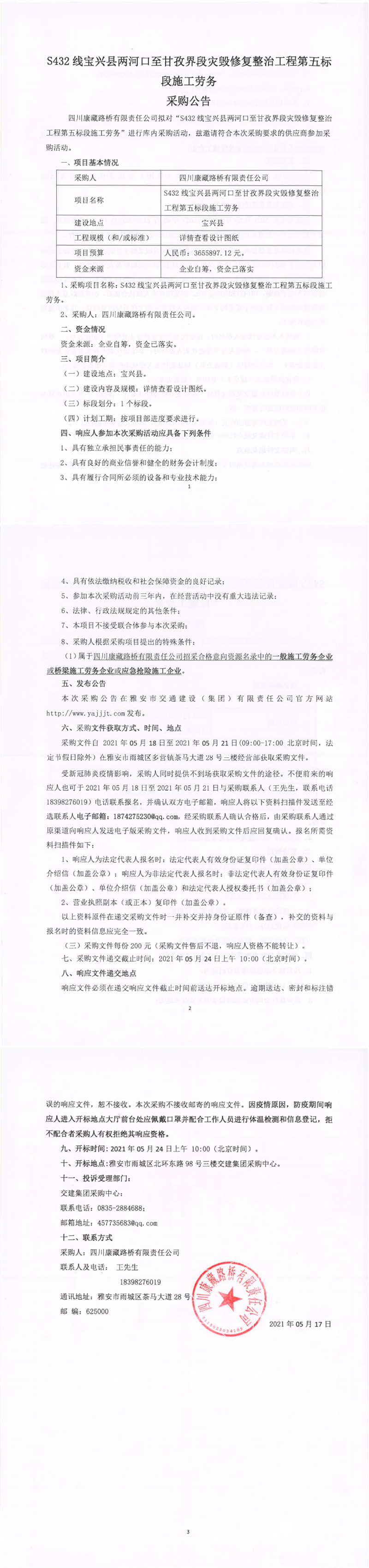 四川康藏路橋有限責(zé)任公司S432線寶興縣兩河口至甘孜界段災(zāi)毀修復(fù)整治工程第五標(biāo)段施工勞務(wù)采購公告