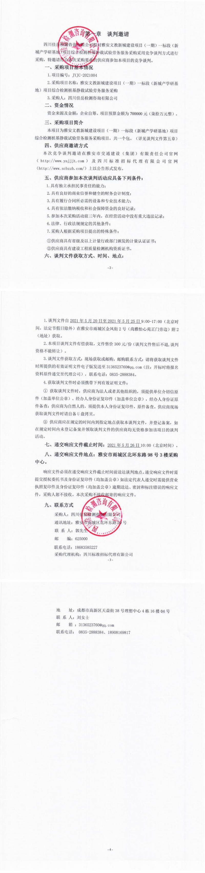 四川佳岳檢測(cè)咨詢有限公司雅安文教新城建設(shè)項(xiàng)目(一期)一標(biāo)段(新城產(chǎn)學(xué)研基地)項(xiàng)目綜合檢測(cè)樁基靜載試驗(yàn)勞務(wù)服務(wù)競(jìng)爭(zhēng)談判公告