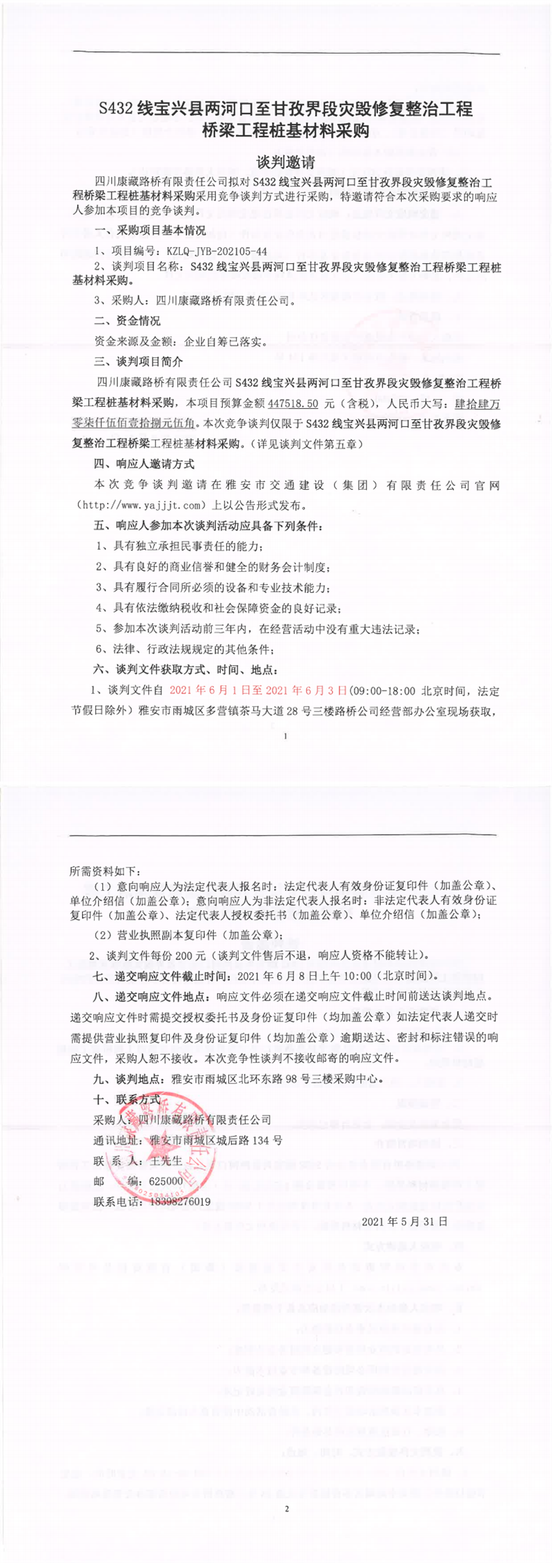 四川康藏路橋有限責(zé)任公司S432線寶興縣兩河口至甘孜界段災(zāi)毀修復(fù)整治工程橋梁樁基材料采購競爭談判公告