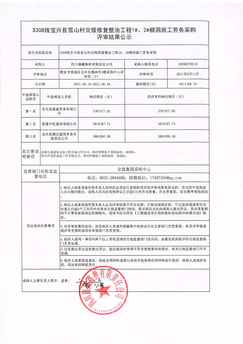 四川康藏路橋有限責(zé)任公司S308線寶興縣雪山村災(zāi)毀修復(fù)整治工程1#、2#棚洞施工勞務(wù)采購(gòu)評(píng)審結(jié)果公示