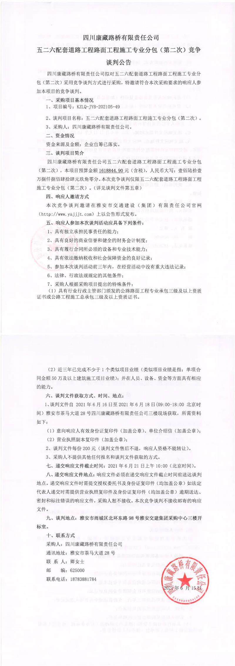 四川康藏路橋有限責(zé)任公司五二六配套道路工程路面工程施工專業(yè)分包(第二次)競(jìng)爭(zhēng)談判公告