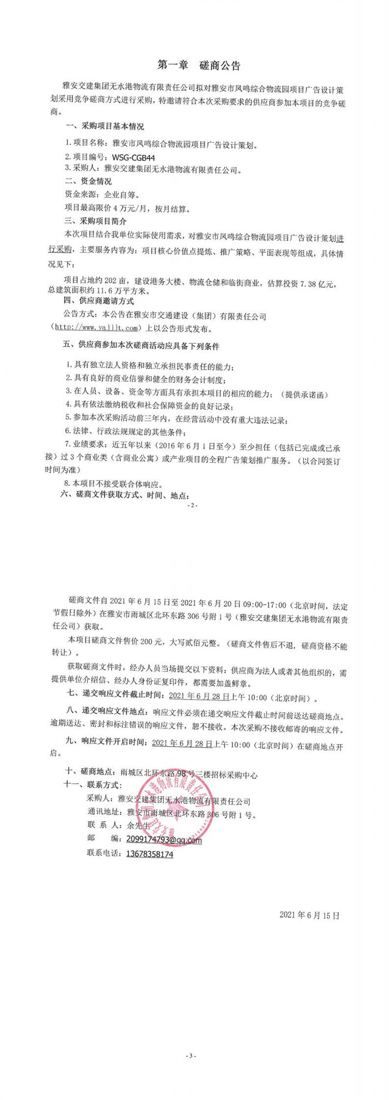 雅安交建集團無水港物流有限責(zé)任公司雅安市鳳鳴綜合物流園項目廣告設(shè)計策劃磋商公告