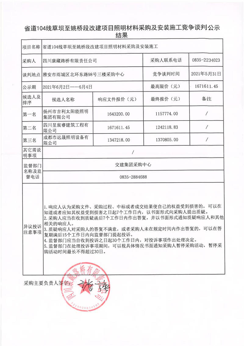 四川康藏路橋有限責(zé)任公司省道104線草壩至姚橋段改建項(xiàng)目照明材料采購及安裝施工競爭談判公示結(jié)果