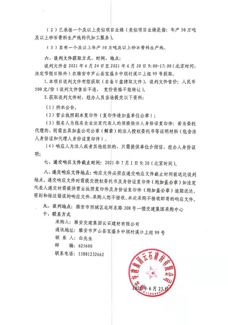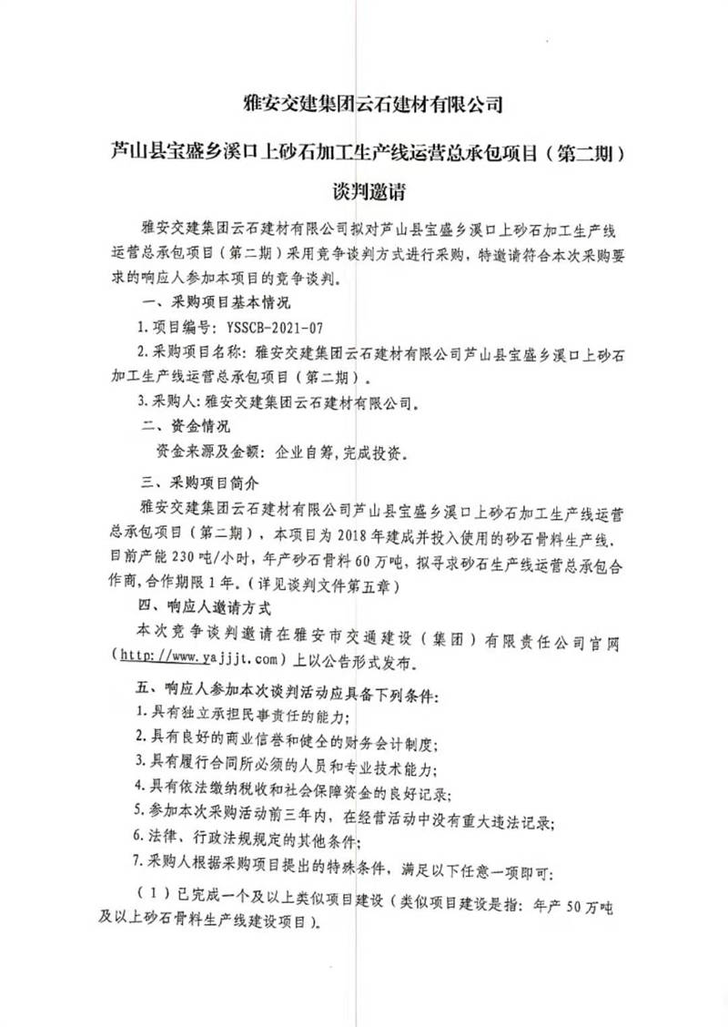 雅安交建集團云石建材有限公司蘆山縣寶盛鄉(xiāng)溪口上砂石加工生產線運營總承包項目(第二期)競爭談判公告