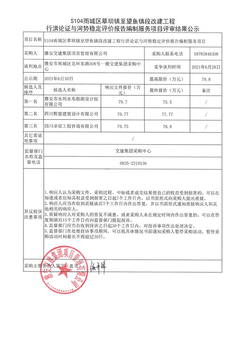 雅安交建集團(tuán)項(xiàng)目管理有限公司S104雨城區(qū)草壩鎮(zhèn)至望魚鎮(zhèn)段改建工程行洪論證與河勢穩(wěn)定評價報(bào)告編制服務(wù)項(xiàng)目評審結(jié)果公示