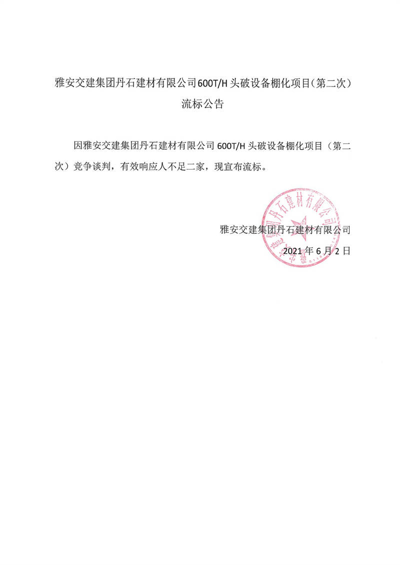 雅安交建集團(tuán)丹石建材有限公司600T/H頭破設(shè)備棚化項目(第二次)流標(biāo)公告