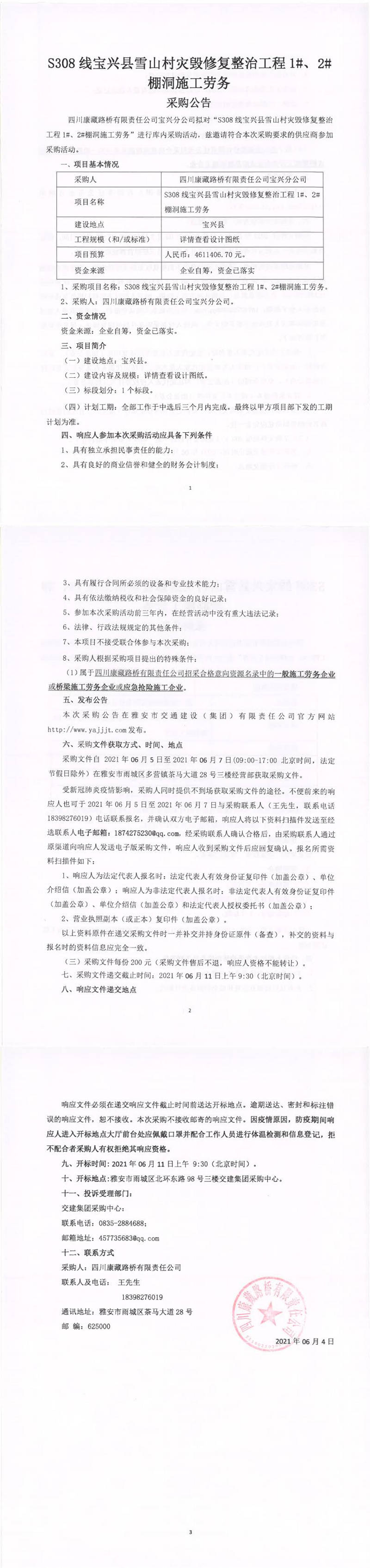 四川康藏路橋有限責任公司S308線寶興縣雪山村災(zāi)毀修復(fù)整治工程1#、2#棚洞施工勞務(wù)采購公告