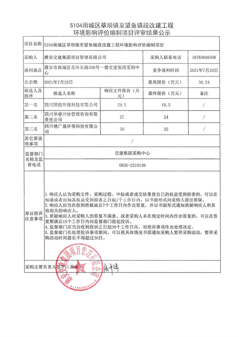 雅安交建集團(tuán)項(xiàng)目管理有限公司S104雨城區(qū)草壩鎮(zhèn)至望魚鎮(zhèn)段改建工程水土保持方案編制服務(wù)項(xiàng)目評審結(jié)果公示