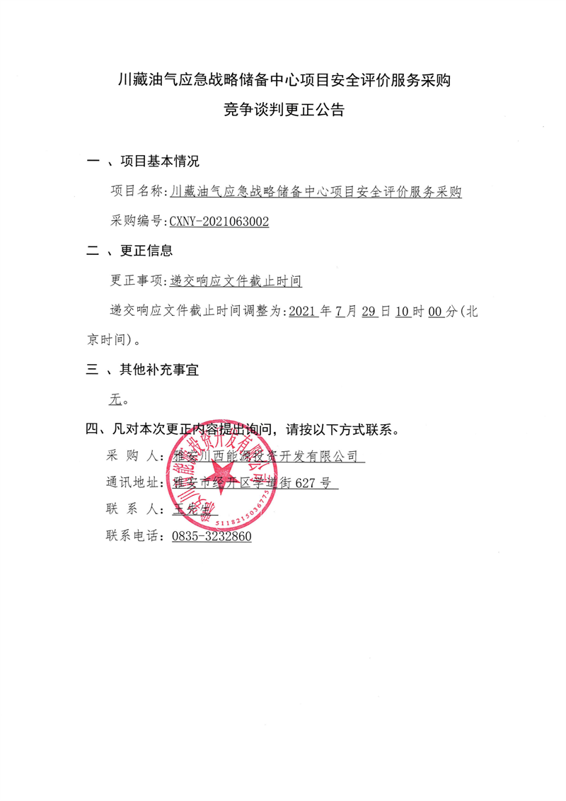 雅安川西能源投資開(kāi)發(fā)有限公司川藏油氣應(yīng)急戰(zhàn)略儲(chǔ)備中心項(xiàng)目安全評(píng)價(jià)服務(wù)采購(gòu)競(jìng)爭(zhēng)談判更正公告