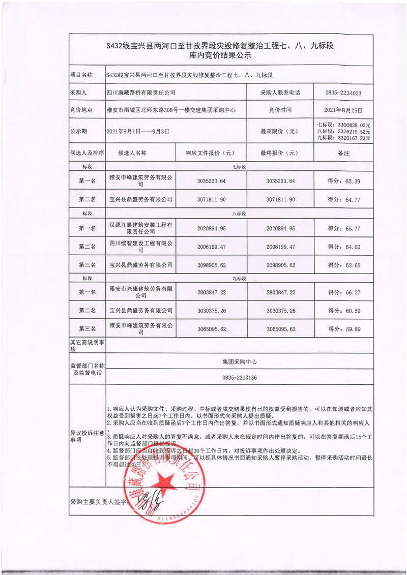 四川康藏路橋有限責任公司S432線寶興縣兩河口至甘孜界段災毀修復整治工程七、八、九標段庫內競價結果公示