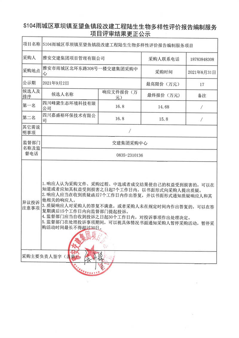 雅安交建集團(tuán)項(xiàng)目管理有限公司S104雨城區(qū)草壩鎮(zhèn)至望魚鎮(zhèn)段改建工程陸生生物多樣性評(píng)價(jià)報(bào)告編制服務(wù)項(xiàng)目評(píng)審結(jié)果更正公示