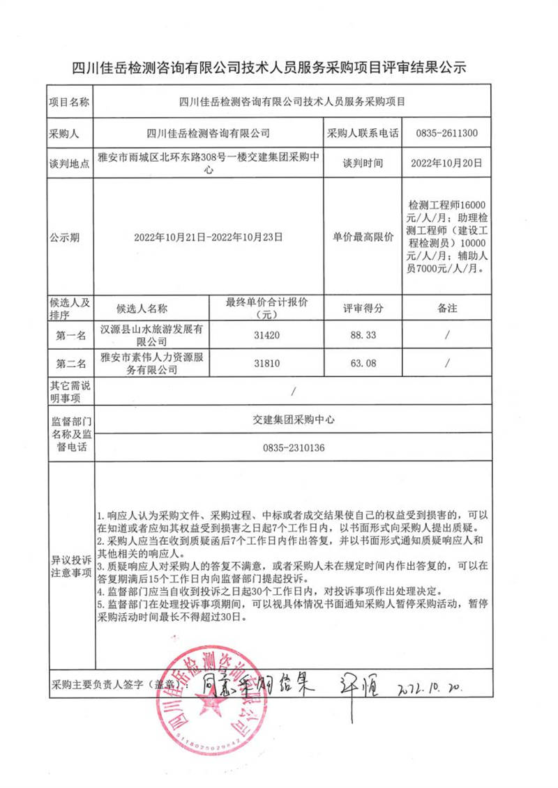 四川佳岳檢測咨詢有限公司技術人員服務采購項目評審結果公示