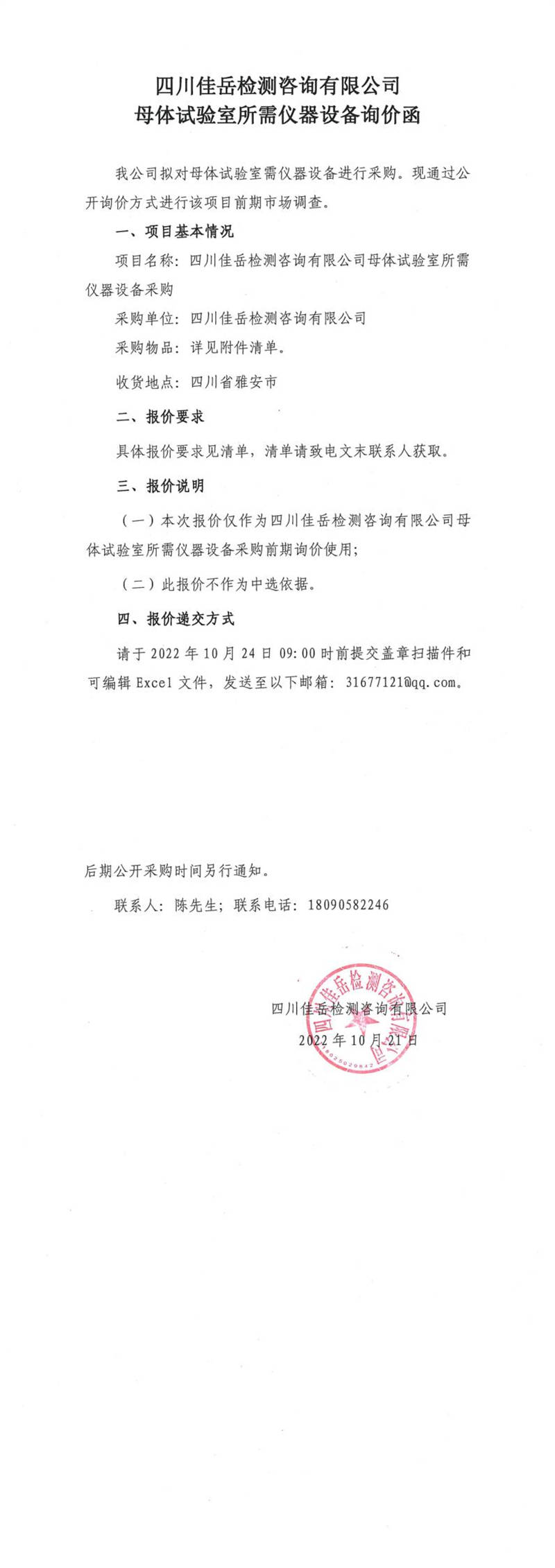 四川佳岳檢測(cè)咨詢(xún)有限公司母體試驗(yàn)室所需儀器設(shè)備詢(xún)價(jià)函