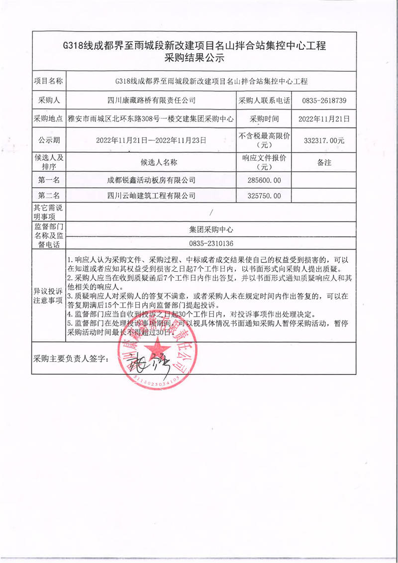 四川康藏路橋有限責(zé)任公司G318線成都界至雨城段新改建項(xiàng)目名山拌合站集控中心工程采購(gòu)結(jié)果公示