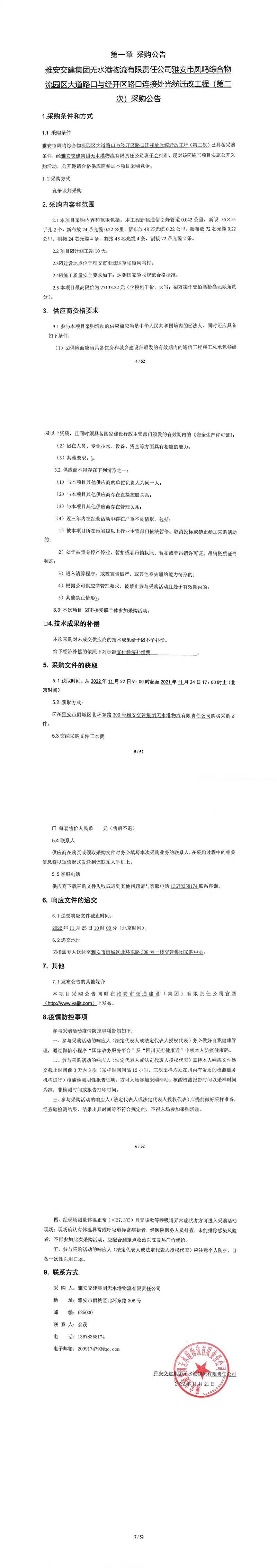 雅安交建集團無水港物流有限責(zé)任公司雅安市鳳鳴綜合物流園區(qū)大道路口與經(jīng)開區(qū)路口連接處光纜遷改工程(第二次)采購公告