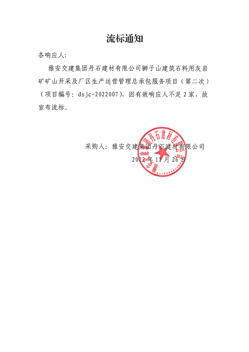 雅安交建集團丹石建材有限公司獅子山建筑石料用灰?guī)r礦礦山開采及廠區(qū)生產(chǎn)運營管理總承包服務(wù)項目(第二次)流標(biāo)通知
