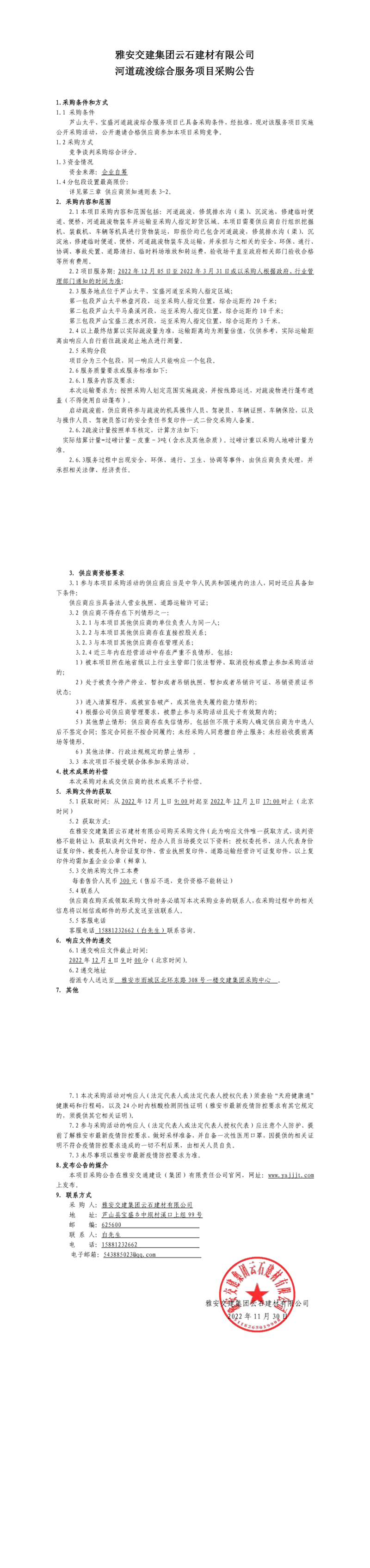 雅安交建集團云石建材有限公司河道疏浚綜合服務項目采購公告