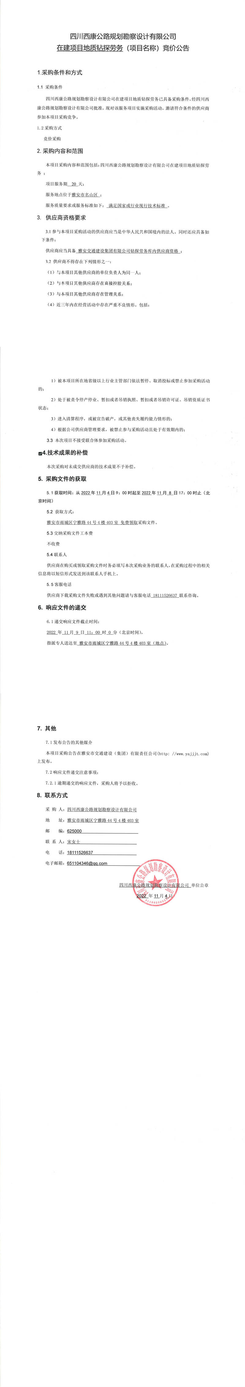 四川西康公路規(guī)劃勘察設(shè)計有限公司在建項目地質(zhì)鉆探勞務(wù)(項目名稱)競價公告