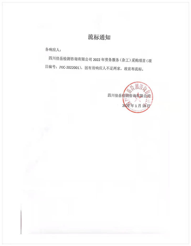 四川佳岳檢測咨詢有限公司2022年勞務服務(雜工)采購項目流標通知