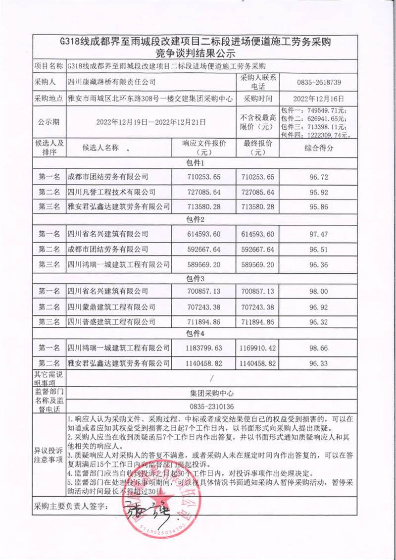 四川康藏路橋有限責(zé)任公司G318線成都界至雨城段改建項目二標(biāo)段進(jìn)場便道施工勞務(wù)采購競爭談判結(jié)果公示
