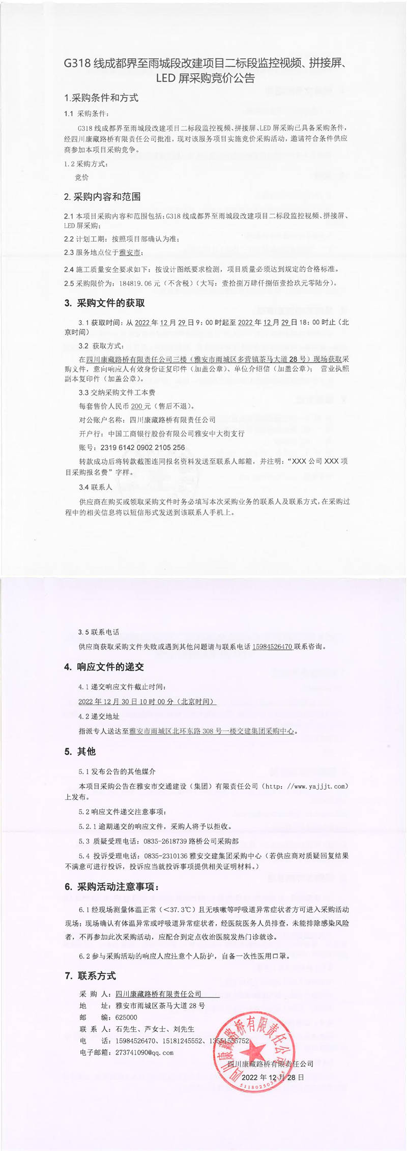 四川康藏路橋有限責(zé)任公司G318線成都界至雨城段改建項(xiàng)目二標(biāo)段監(jiān)控視頻、拼接屏、LED屏采購競價公告