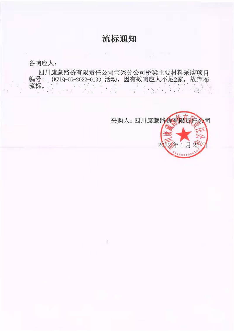 四川康藏路橋有限責(zé)任公司寶興分公司橋梁主要材料采購(gòu)項(xiàng)目流標(biāo)通知