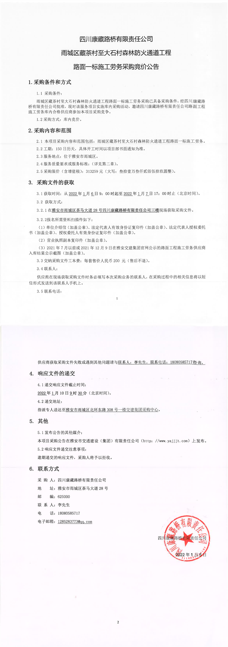 四川康藏路橋有限責(zé)任公司雨城區(qū)藏茶村至大石村森林防火通道工程路面一標(biāo)施工勞務(wù)采購競價公告