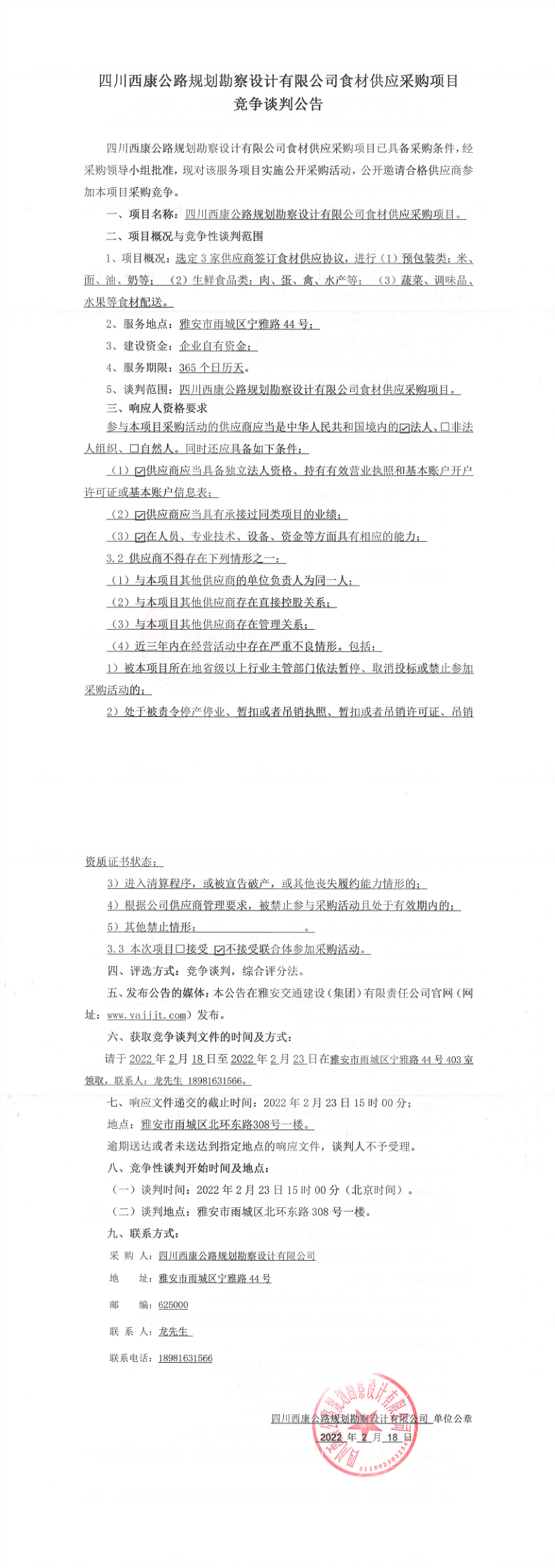 四川西康公路規(guī)劃勘察設計有限公司食材供應采購項目競爭談判公告