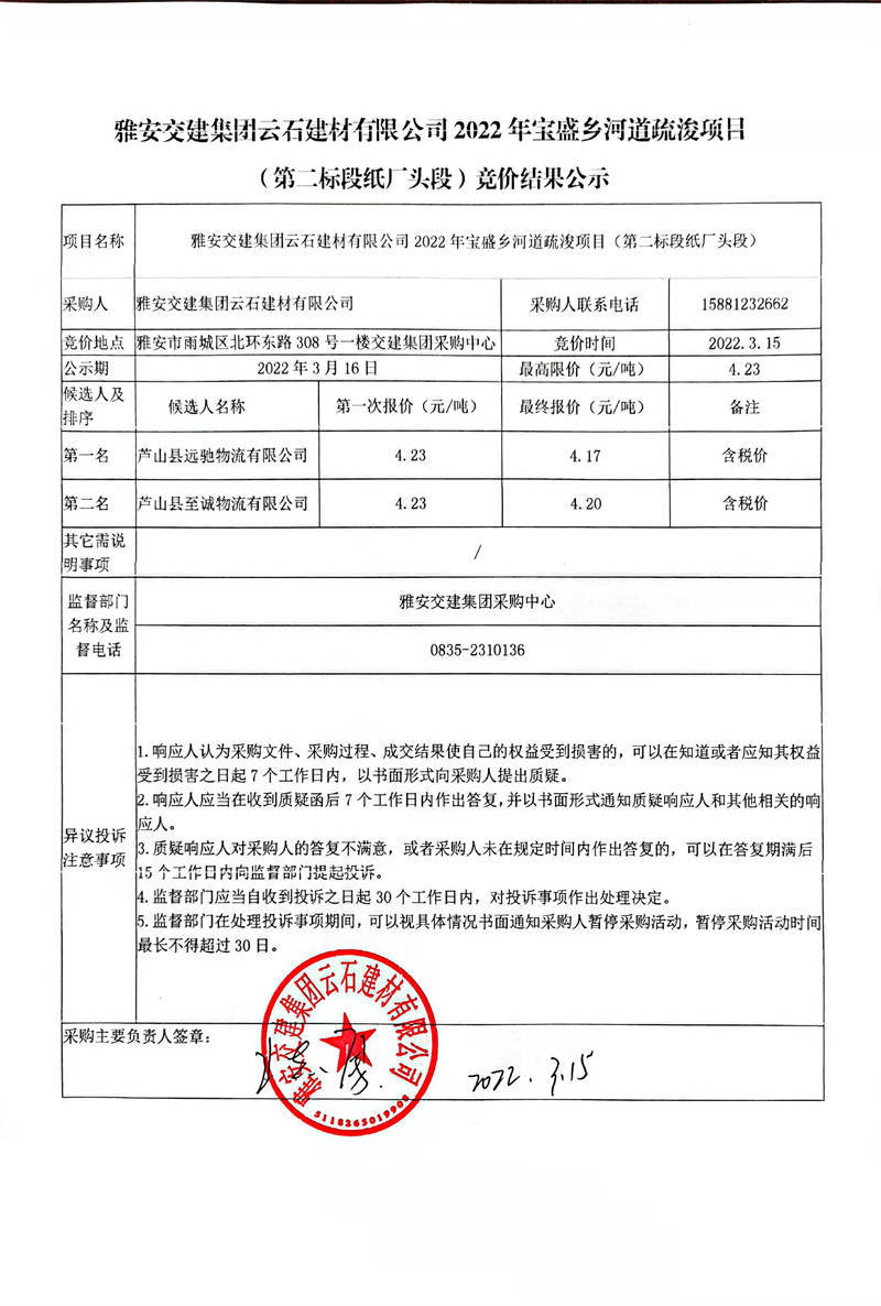 雅安交建集團(tuán)云石建材有限公司2022年寶盛鄉(xiāng)河道疏浚項(xiàng)目(第二標(biāo)段紙廠頭段)競(jìng)價(jià)結(jié)果公示