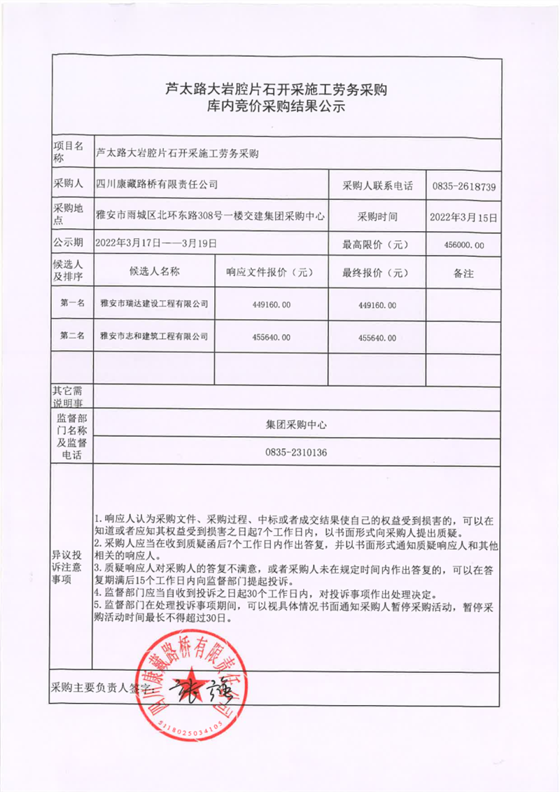 四川康藏路橋有限責任公司蘆太路大巖腔片石開采施工勞務采購庫內(nèi)競價采購結(jié)果公示