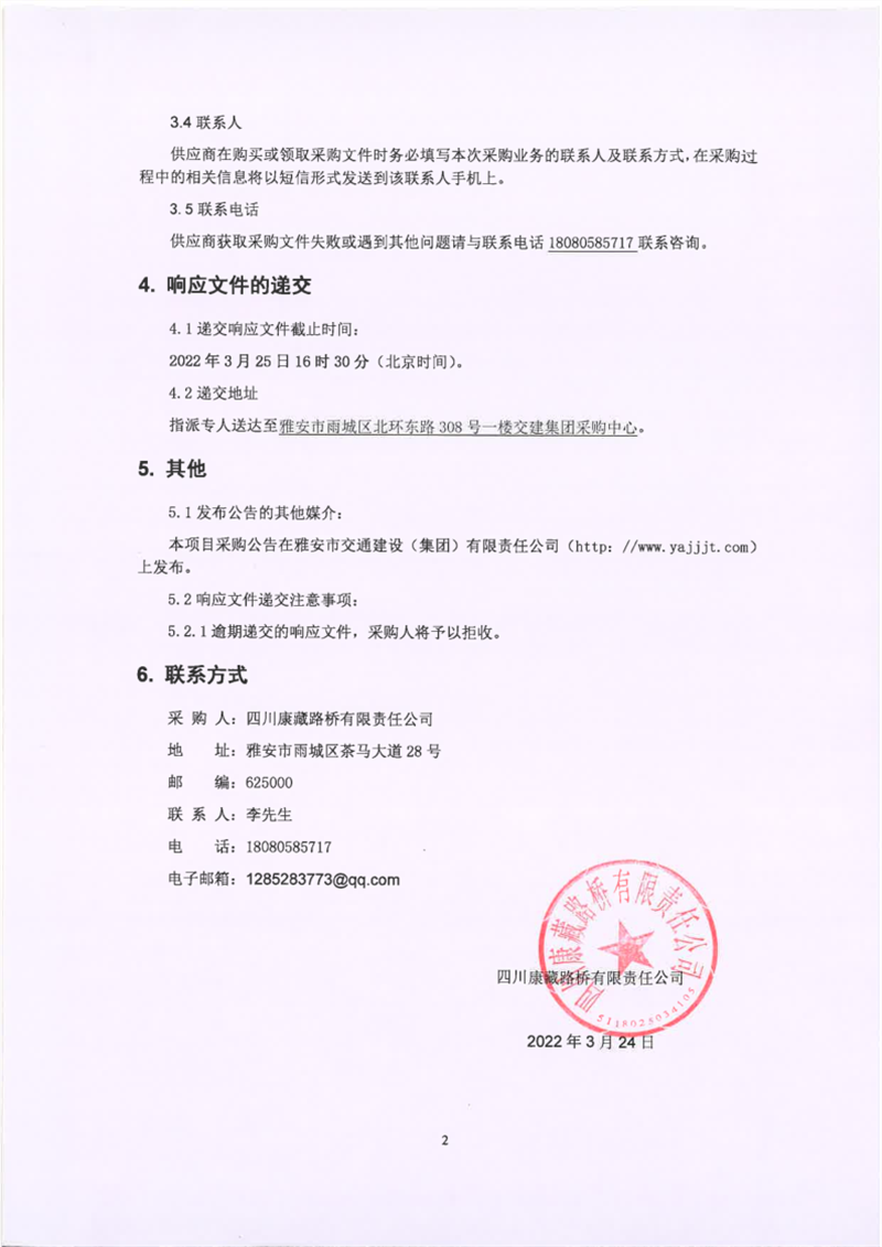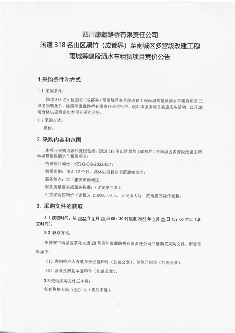 四川康藏路橋有限責(zé)任公司國道318名山區(qū)黑竹(成都界)至雨城區(qū)多營段改建工程雨城籌建段灑水車租賃項目競價公告