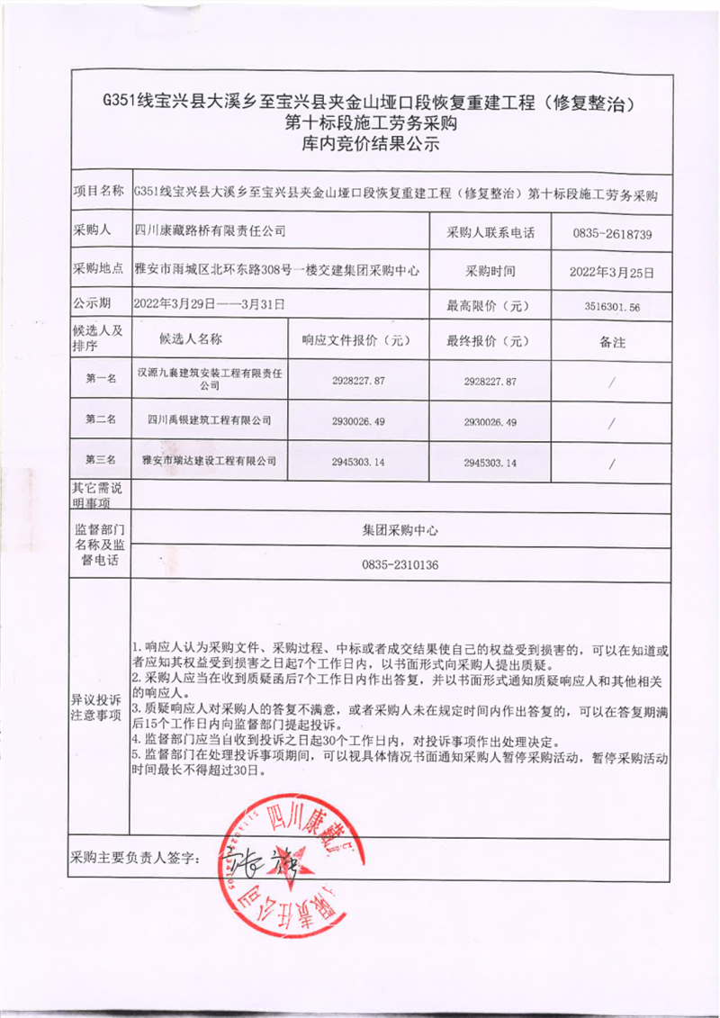 四川康藏路橋有限責(zé)任公司寶興分公司G351線寶興縣大溪鄉(xiāng)至寶興縣夾金山埡口段恢復(fù)重建工程(修復(fù)整治)第十標(biāo)段施工勞務(wù)采購庫內(nèi)競價(jià)結(jié)果公示