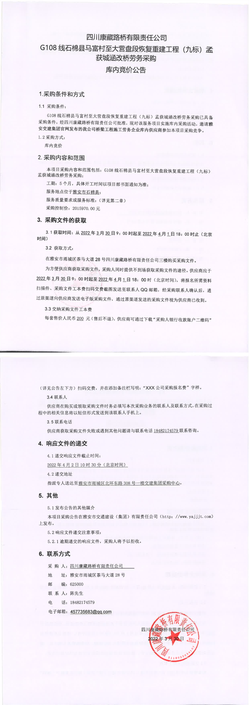 四川康藏路橋有限責(zé)任公司G108線石棉縣馬富村至大營盤段恢復(fù)重建工程(九標(biāo))孟獲城涵改橋勞務(wù)采購庫內(nèi)競價(jià)公告