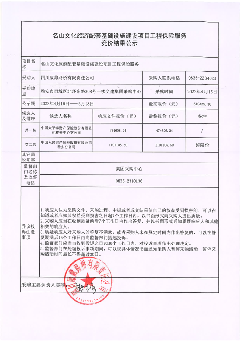 四川康藏路橋有限責任公司名山文化旅游配套基礎設施建設項目工程保險服務競價結果公示