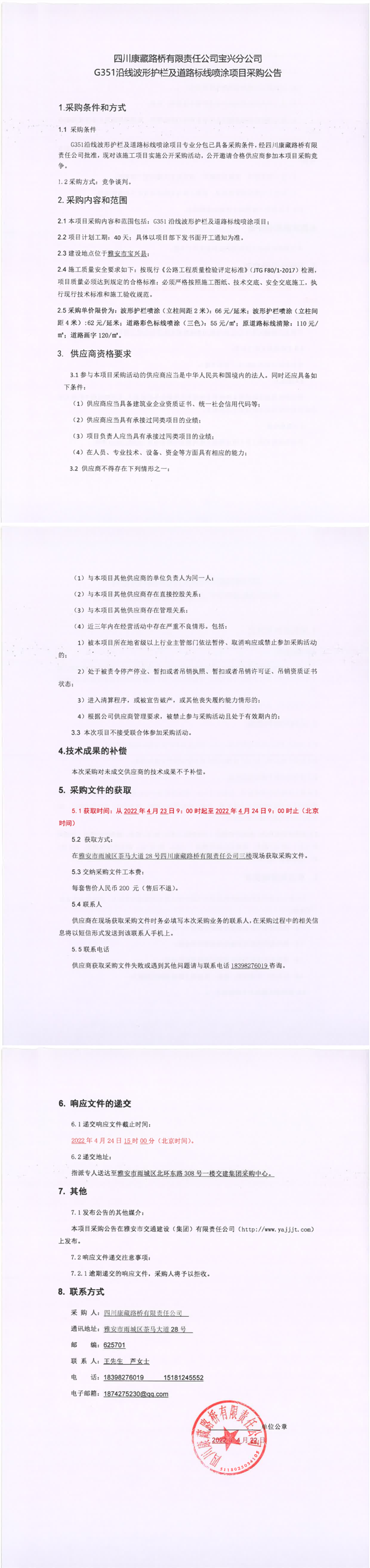 四川康藏路橋有限責(zé)任公司寶興分公司G351沿線波形護欄及道路標(biāo)線噴涂項目采購公告
