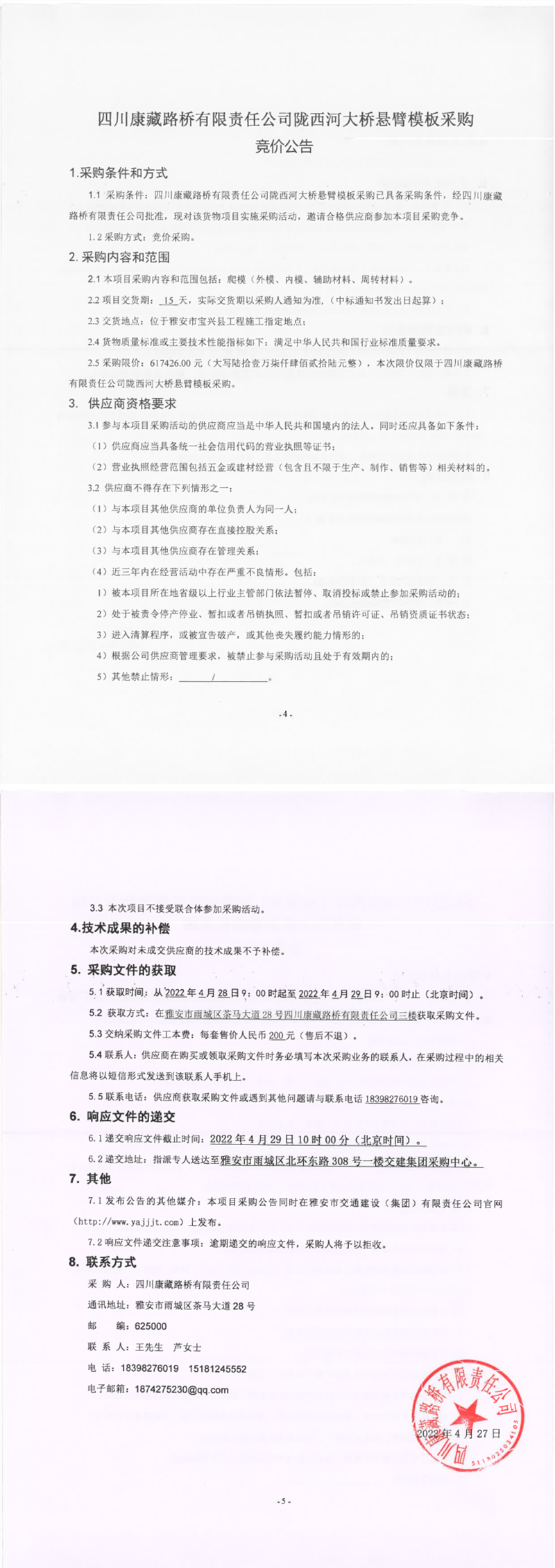 四川康藏路橋有限責(zé)任公司隴西河大橋懸臂模板采購競(jìng)價(jià)公告