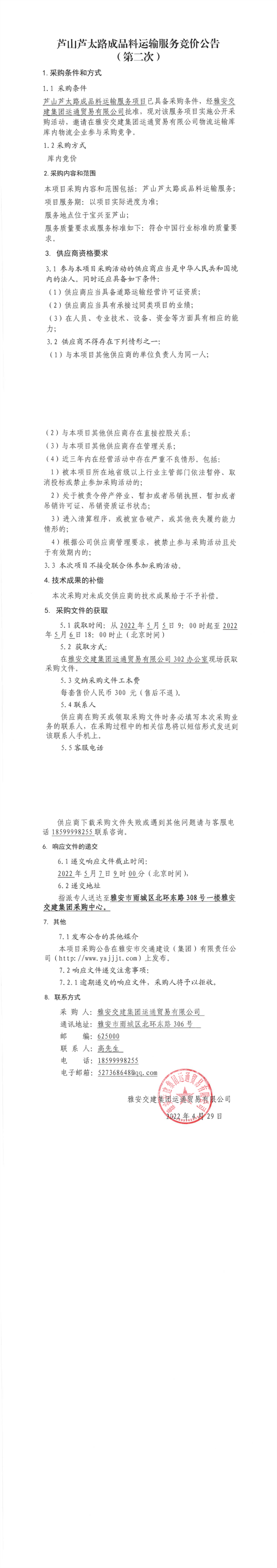 雅安交建集團(tuán)運(yùn)通貿(mào)易有限公司蘆山蘆太路成品料運(yùn)輸服務(wù)競(jìng)價(jià)公告(第二次)