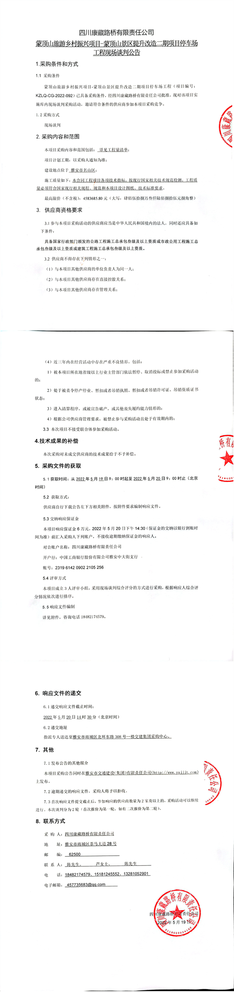 四川康藏路橋有限責(zé)任公司蒙頂山旅游鄉(xiāng)村振興項(xiàng)目-蒙頂山景區(qū)提升改造二期項(xiàng)目停車(chē)場(chǎng)工程現(xiàn)場(chǎng)談判公告
