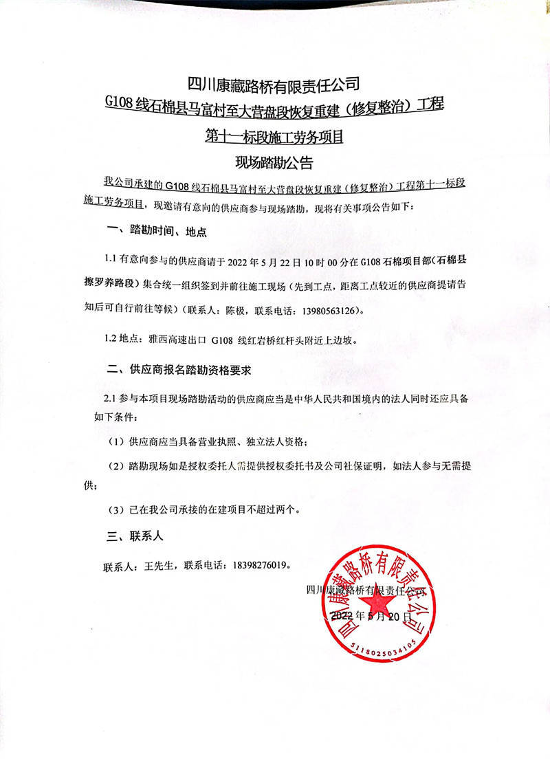 四川康藏路橋有限責任公司G108線石棉縣馬福村至大營盤段恢復重建(修復整治)工程第十一標段施工勞務項目現(xiàn)場踏勘公告