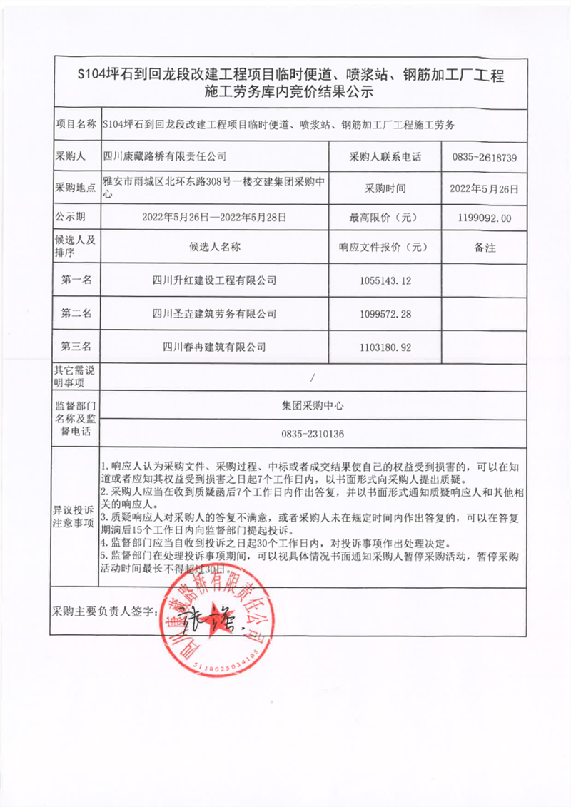 四川康藏路橋有限責(zé)任公司S104坪石到回龍改建工程項(xiàng)目臨時(shí)便道、噴漿站、鋼筋加工廠(chǎng)工程施工勞務(wù)庫(kù)內(nèi)競(jìng)價(jià)結(jié)果公示
