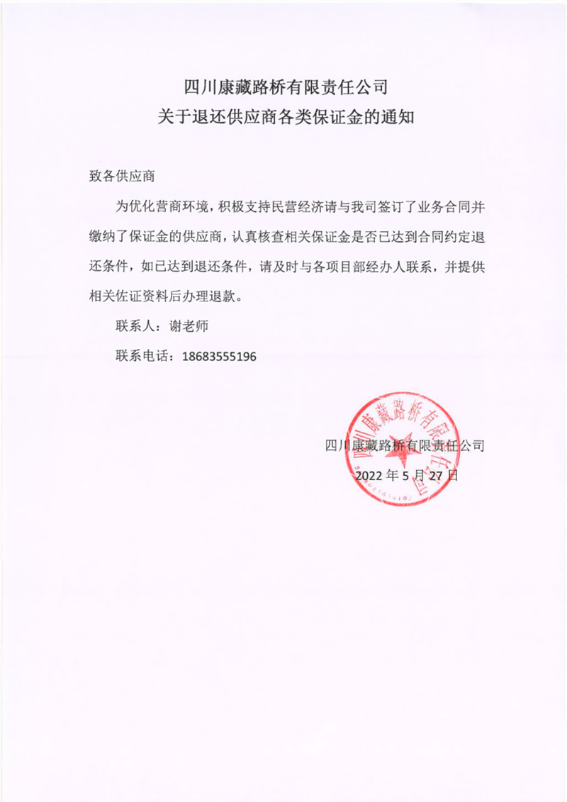 四川康藏路橋有限責任公司關(guān)于退還供應商各類保證金的通知