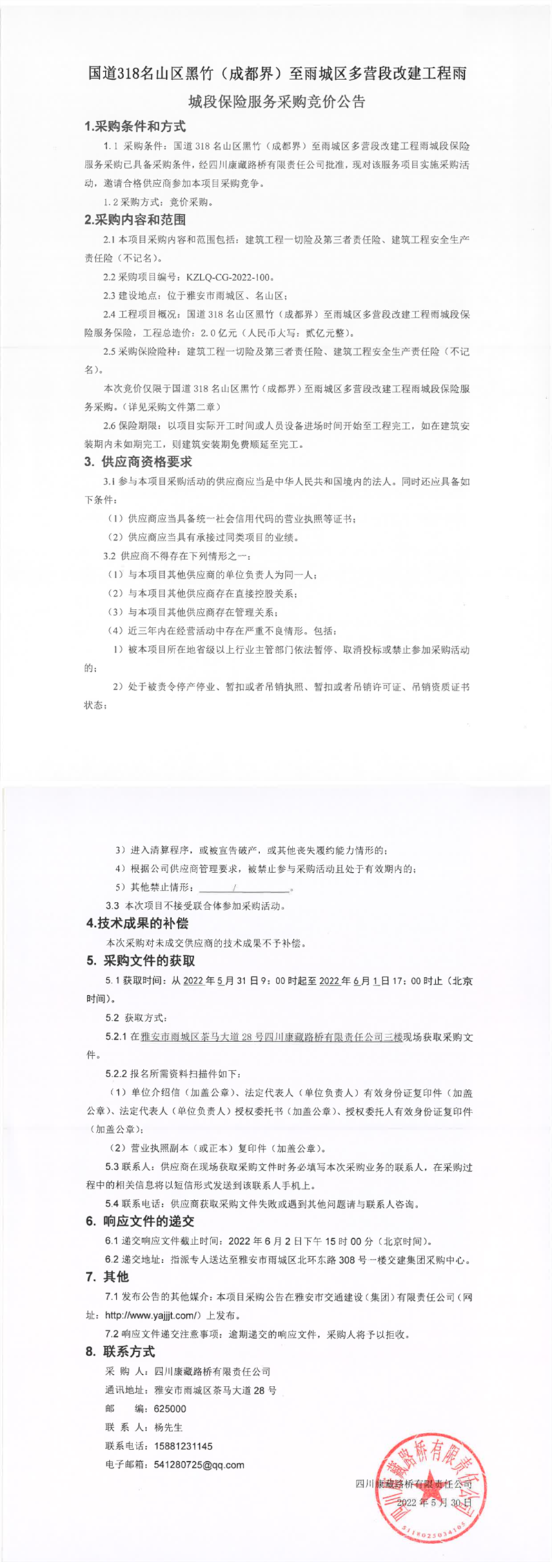 四川康藏路橋有限責任公司國道318名山區(qū)黑竹(成都界)至雨城區(qū)多營段改建工程雨城段保險服務采購競價公告