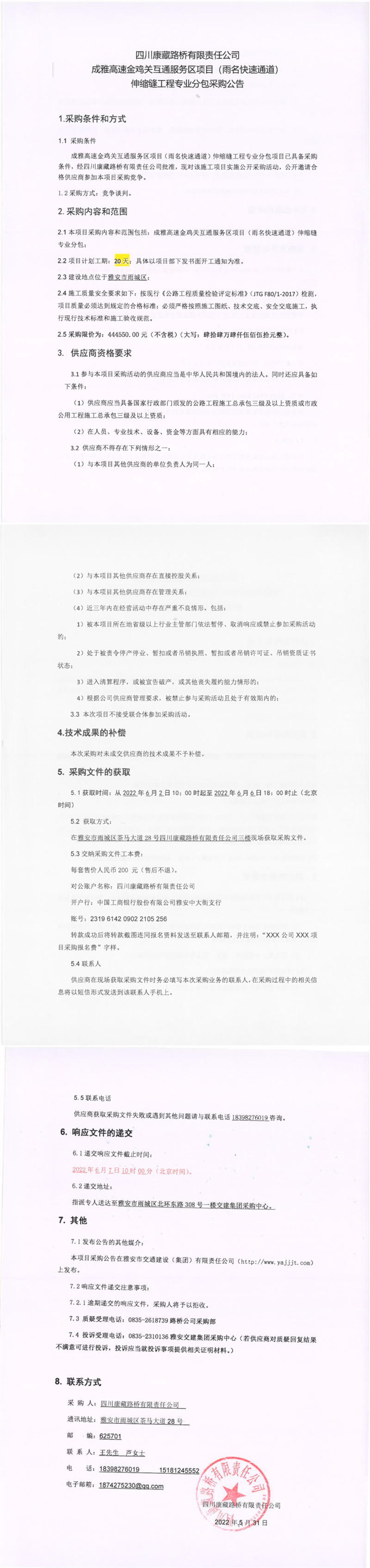 四川康藏路橋有限責任公司成雅高速金雞關互通服務區(qū)項目(雨名快速通道)伸縮縫工程專業(yè)分包采購公告