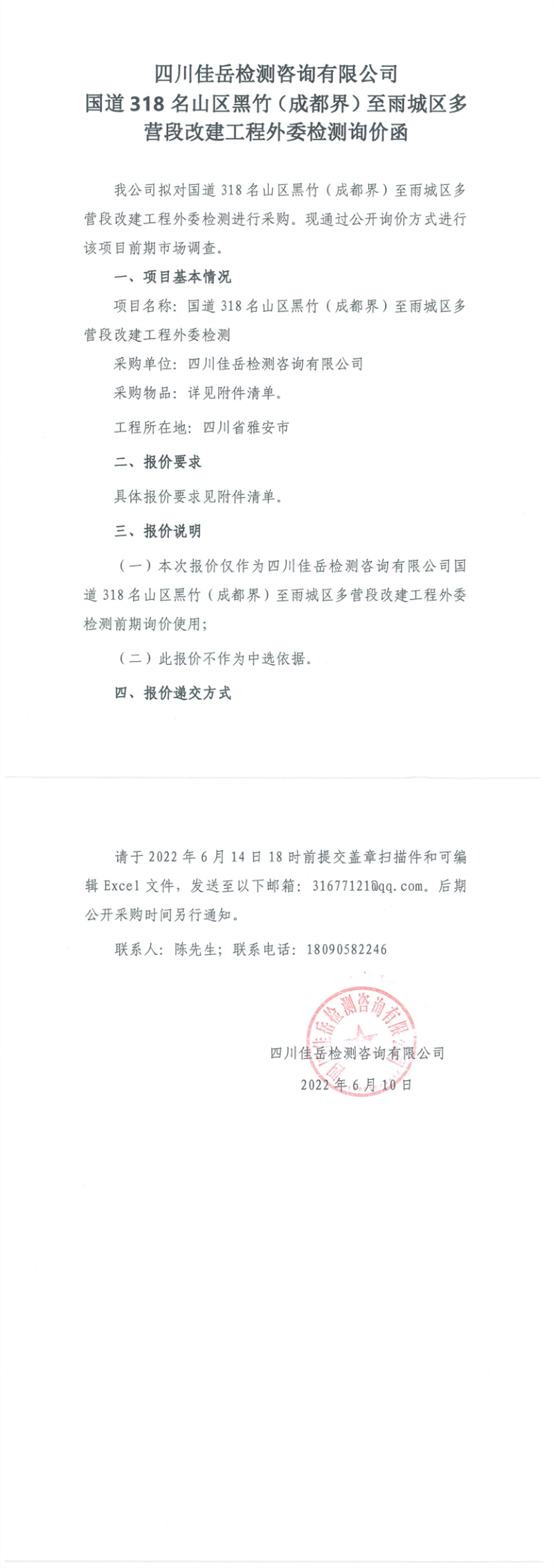 四川佳岳檢測咨詢有限公司國道318名山區(qū)黑竹(成都界)至雨城區(qū)多營段改建工程外委檢測詢價(jià)函