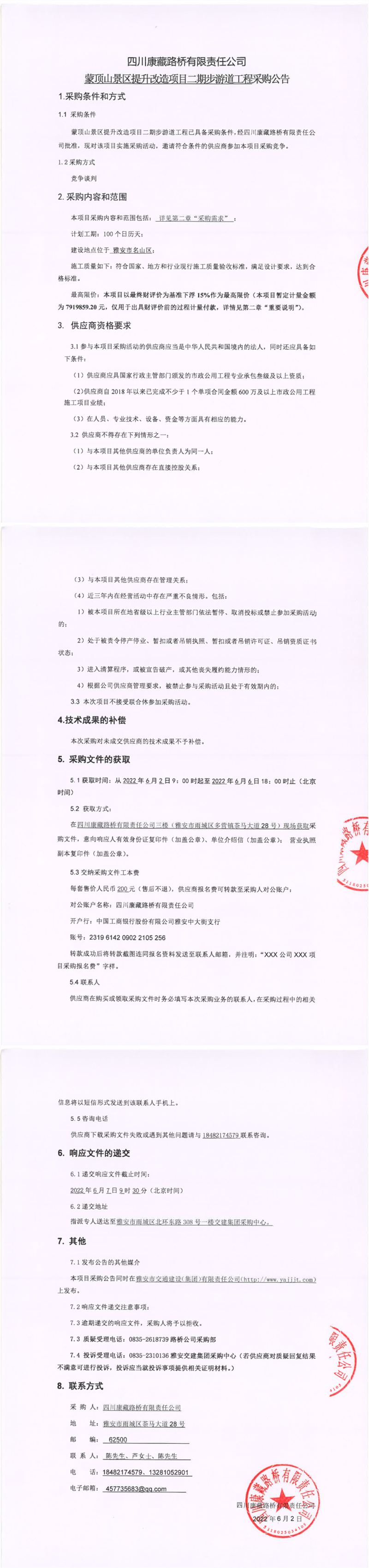 四川康藏路橋有限責(zé)任公司蒙頂山景區(qū)提升改造項(xiàng)目二期步游道工程采購(gòu)公告