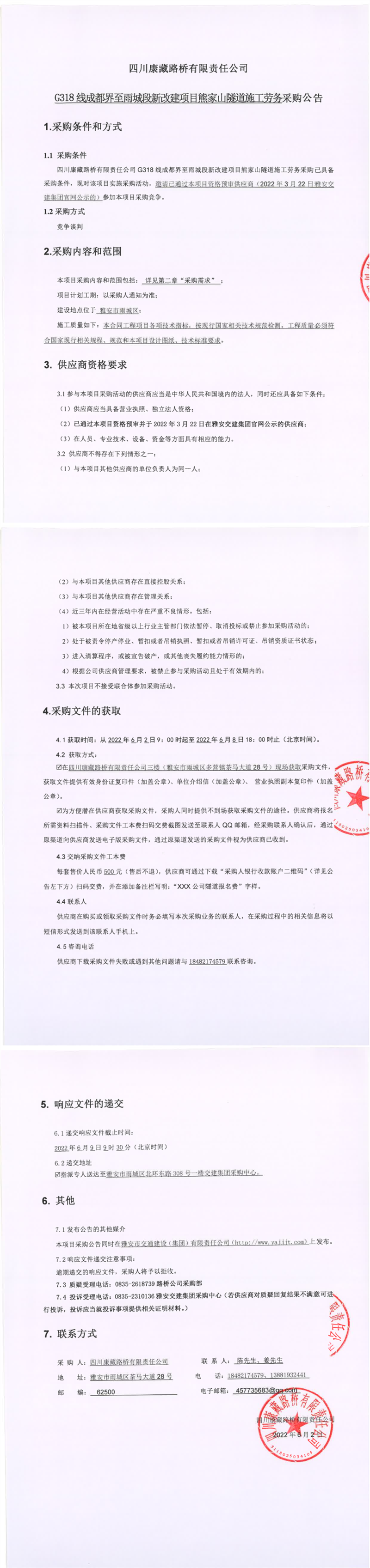 四川康藏路橋有限責(zé)任公司G318線成都界至雨城段新改建項目熊家山隧道施工勞務(wù)采購公告